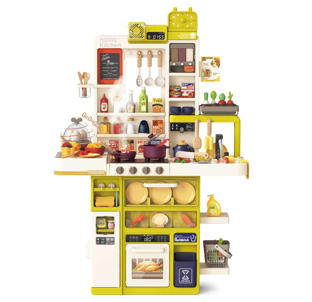 Mama Kiddies Interaktív "Spraying Kitchen" Játékkonyha – 121 darabos készlet,103 cm magas fény- és hangeffektekkel sárgászöld színben